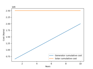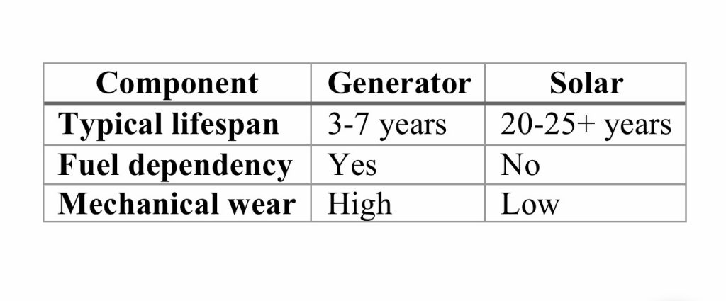 Generators are cheaper at purchase, but that is only the beginning. Solar is capital-intensive upfront, but its operating cost is zero or very low.