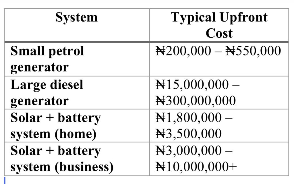 - Solar total: = ₦2.5-3 million (+ minor maintenance)